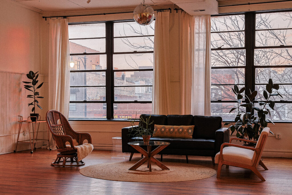 Le Loft is a converted factory at 2418 W North Ave, on the boundary of Logan Square and Bucktown, just steps from Wicker Park. The original industrial windows are floor to ceiling, and in the late afternoon, they pull in a quality of light that changes the room entirely. If your rehearsal toast starts around 6 or 7 PM, you’re working with that light without doing a thing to earn it.