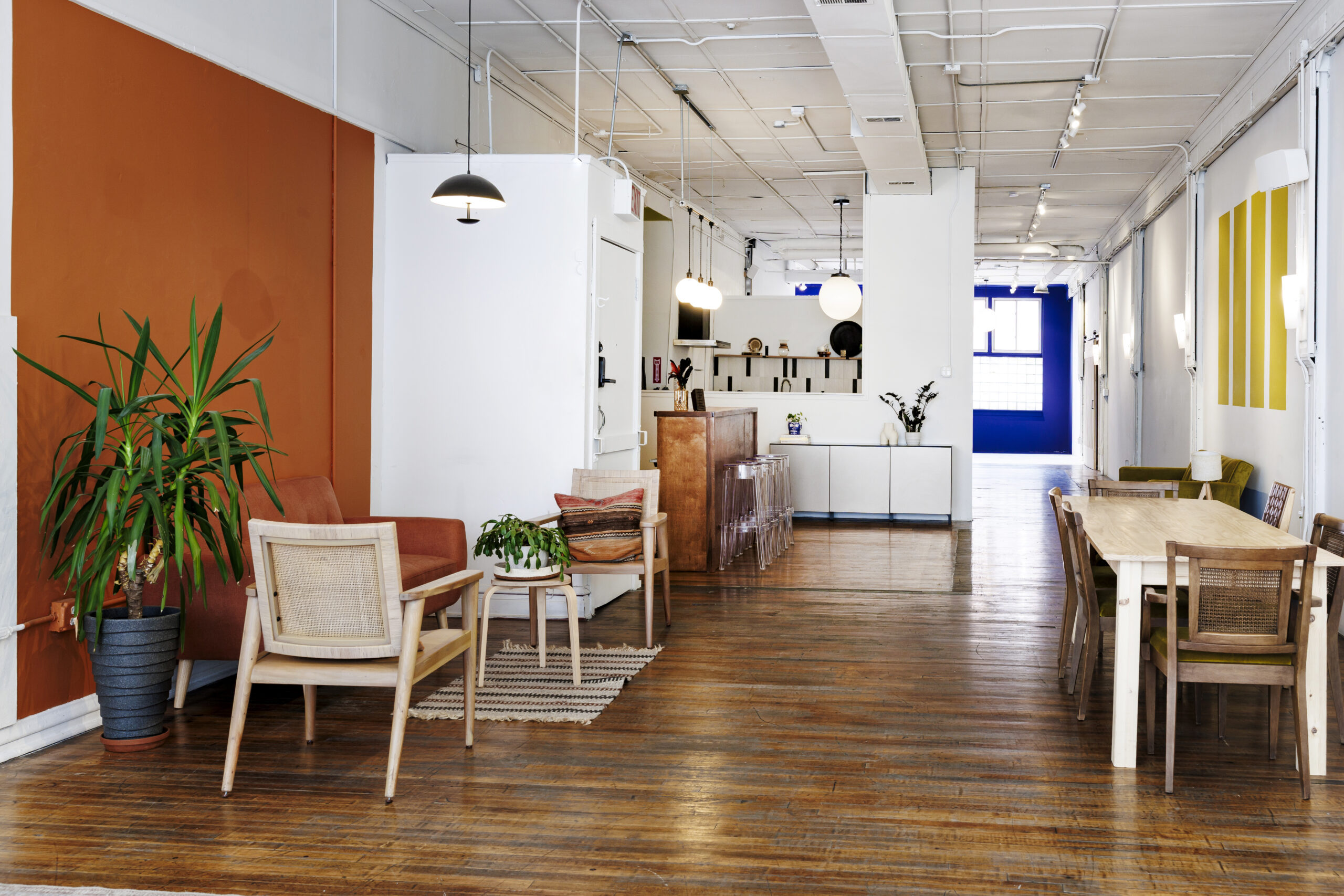 Each side has hardwood floors, large industrial windows, and high ceilings, creating an environment that feels both professional and relaxed.